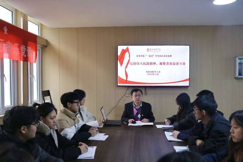 12月2日,音乐学院在“一站式”学生社区举办纪念抗战胜利主题音乐党课。学院党总支副书记韩伟与学生党员、发展对象一起在红色旋律与历史叙事中重温抗战岁月、汲取奋进力量。