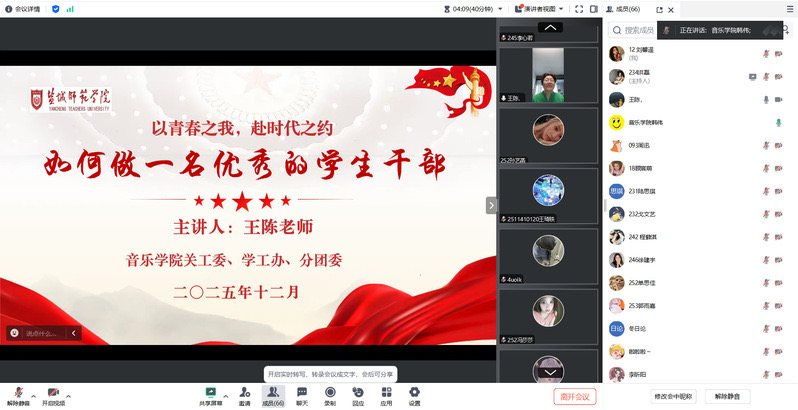 12月9日,音乐学院关工委特邀学院王陈老师为全体学生干部作题为《以青春之我,赴时代之约——如何做一名优秀的学生干部》的专题讲座。讲座以线上形式开展,围绕学生干部的成长路径、价值塑造与能力发展等方面深入交流。