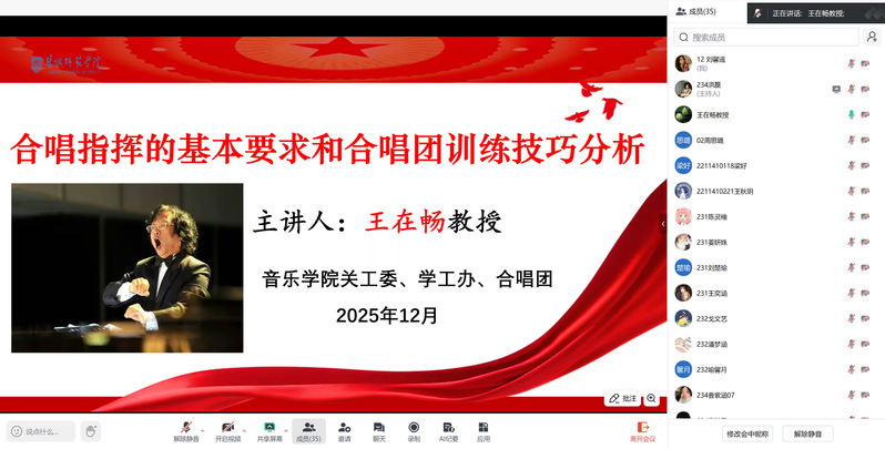 本次讲座是音乐学院关工委发挥老教授专业优势、助力学生成长的重要活动之一。王在畅教授以深厚的学术功底与丰富的艺术经验,为学生们上了生动而深刻的一课。同学们表示,讲座加深了他们对合唱艺术的理解,明确了个人在集体中的责任与定位,对未来参与合唱实践具有重要的指导意义。