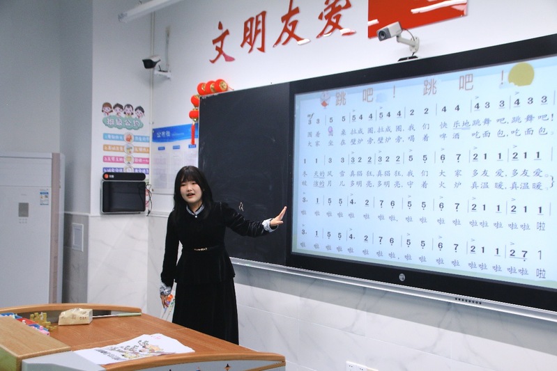 活动现场,志愿者周同学带来了趣味弹唱教学课。她选取了节奏欢快、朗朗上口的儿童歌曲《跳吧!跳吧!》,以边弹边唱的形式,一步步带领孩子们熟悉旋律、跟唱歌词,并配合简单的肢体动作,引导孩子们跟随音乐欢快律动。课堂上,孩子们跟着旋律放声歌唱、尽情舞动,现场气氛轻松活泼,欢声笑语不断,在轻松的氛围中感受音乐带来的快乐。