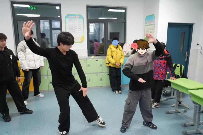 活动中,志愿者们围绕“三角铁”展开趣味音乐小课堂,讲解振动原理,引导孩子们亲手敲击,在清脆声响中感受音乐的魅力。文艺表演与互动教学环节成为活动亮点。志愿者乔同学带来拉丁舞表演,用富有节奏感的舞步感染了在场孩子。表演结束后,她放慢动作,手把手传授基础舞姿,温柔引导孩子们感受舞蹈的韵律之美。与此同时,志愿者周同学、陆同学、王同学等同步开展中国舞基础教学,带领孩子们体会传统舞蹈的柔美与力量。